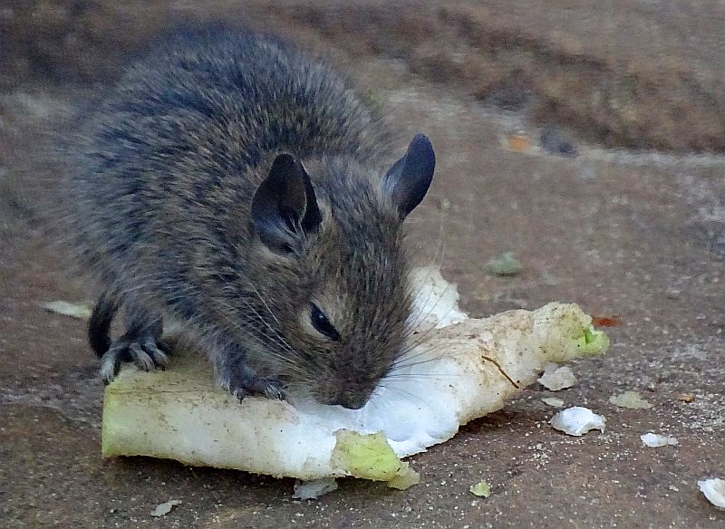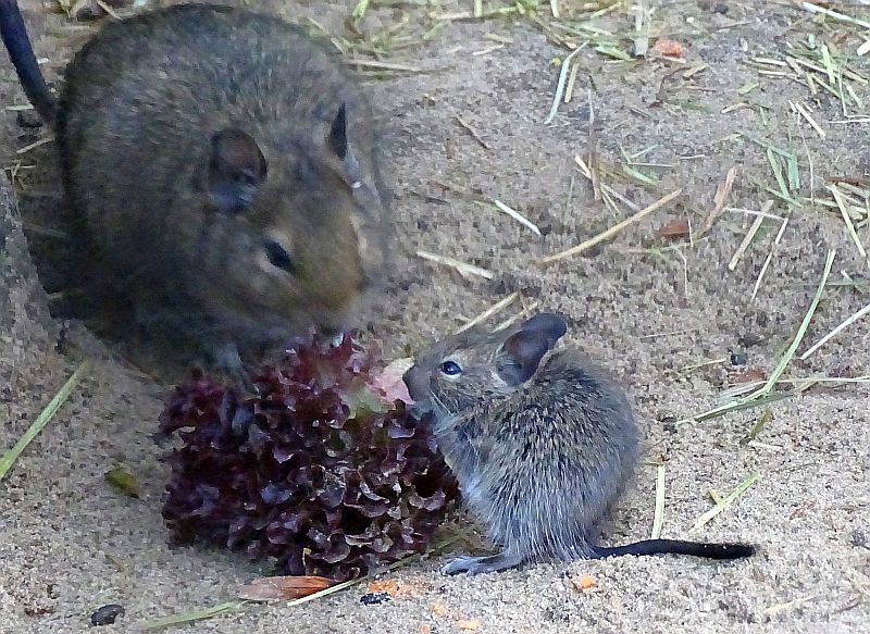Im Tierpark Berlin haben die Degus Jungtiere bekommen. Die auch als Haustier beliebten Degus gehören zu den Nagetieren. Dies fällt sofort auf, wenn man die kleinen Tiere nur für einen kurzen Moment beobachtet. Nichts ist vor ihren Zähnen sicher.