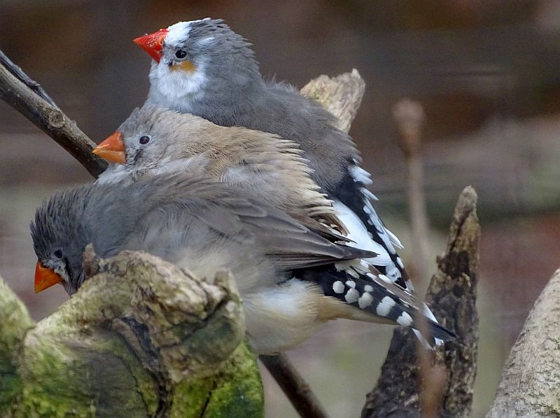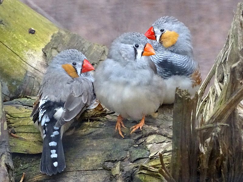 Ob ein Zebrafink männlich oder weiblich ist, lässt sich ganz leicht bestimmen. Die Hähne haben ein schmales schwarzes Band über der Brust, einen großen roten Fleck auf der Wange und das namensgebende Zebra-Muster am Hals. Die Hennen haben weder Wangenfleck noch Zebra-Muster.