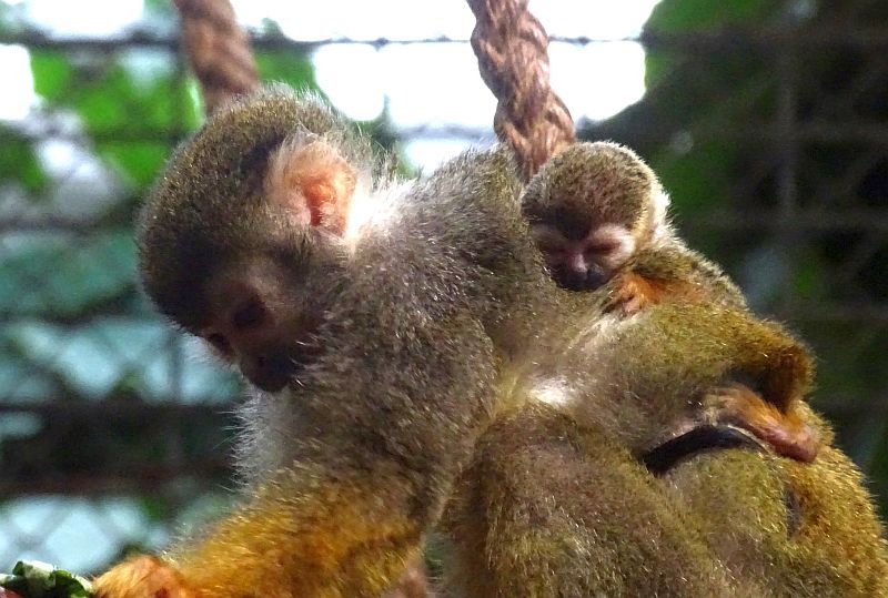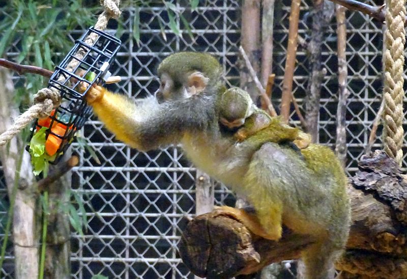 Im Affenhaus vom Zoo Berlin gibt es Nachwuchs bei den Totenkopfäffchen. Auf den Rücken krallt sich das Jungtier im dichten Fell fest und lässt sich durch die Anlage tragen. Zwischendurch klettert es auf den Bauch der Mutter, um gesäugt zu werden.