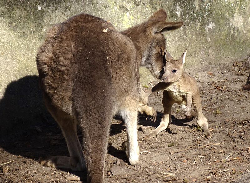Ein Jungtier von den neugeborenen Tasmanischen Grauen Riesenkängurus im Tierpark Berlin hüpft bereits auf der Anlage herum und möchte gerne in einen Beutel eines großen Kängurus krauchen, wo aber bereits ein weiteres Jungtier heraus guckt.