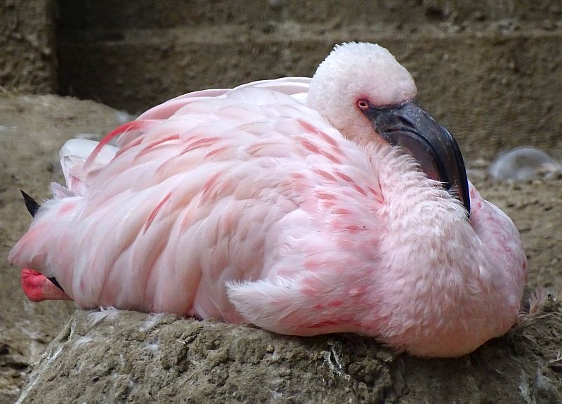 Im Zoo Berlin gibt es bei den Zwergflamingos zweifachen Nachwuchs. Ein Flamingo sitzt noch im Nest und brütet, sodass vielleicht demnächst ein drittes Küken schlüpft.