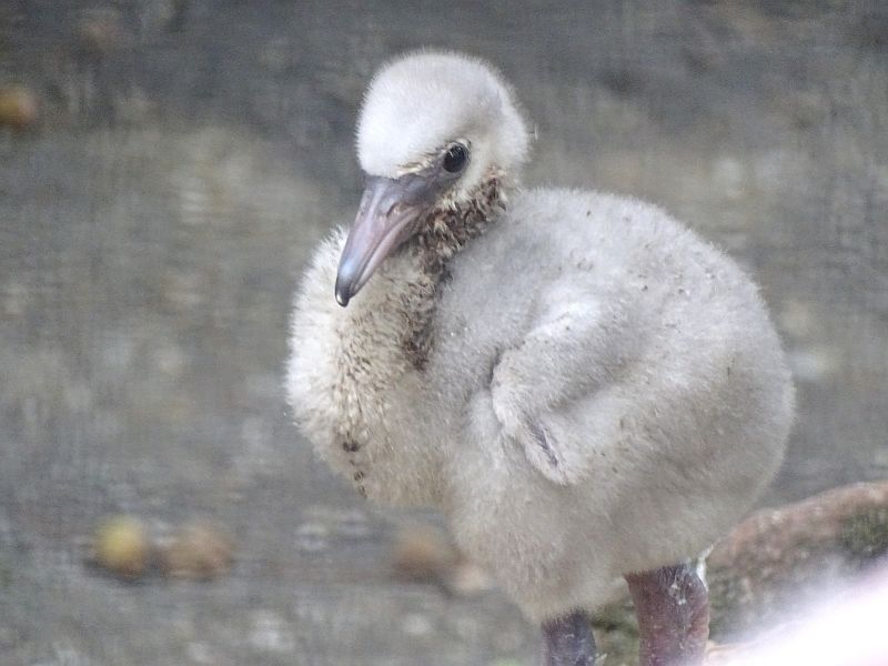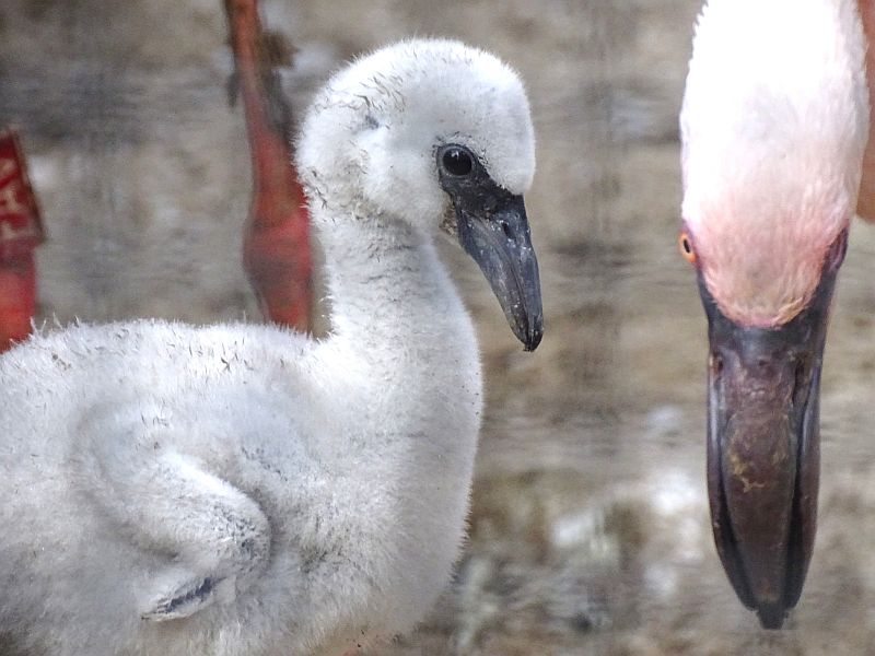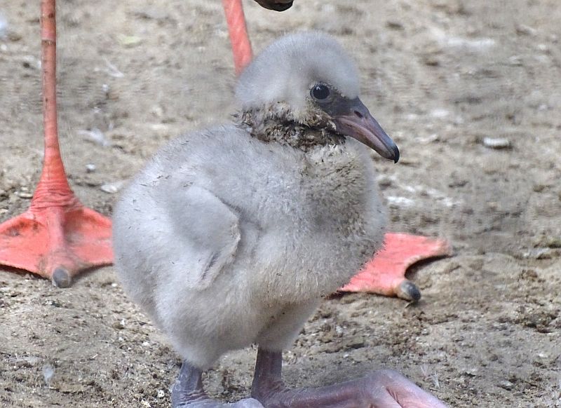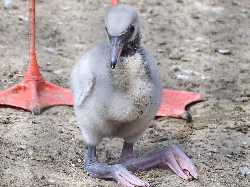 Der Schnabel bei frisch geschlüpften Flamingos ist gerade und erst nach ca. zwei Wochen beginnt er an sich zu krümmen.