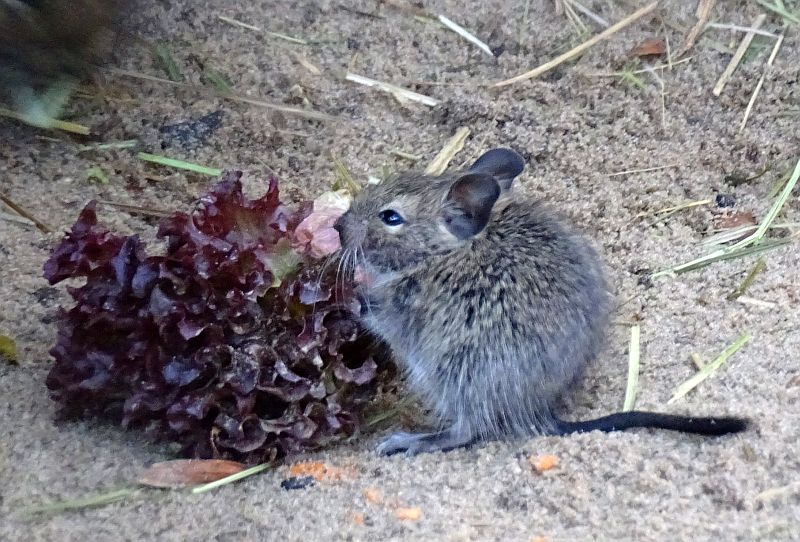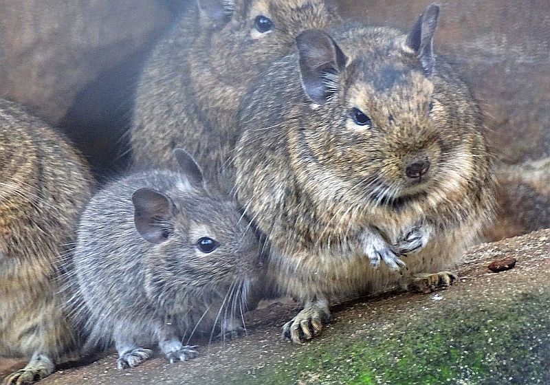 Im Tierpark Berlin haben die Degus Jungtiere bekommen. Die auch als Haustier beliebten Degus gehören zu den Nagetieren. Dies fällt sofort auf, wenn man die kleinen Tiere nur für einen kurzen Moment beobachtet. Nichts ist vor ihren Zähnen sicher.