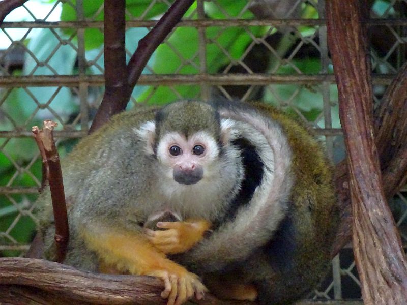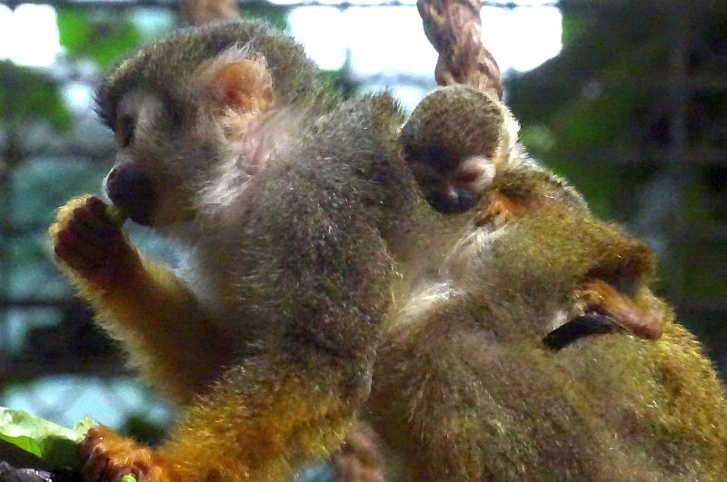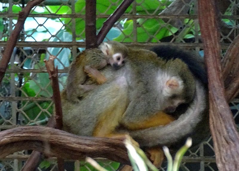 Im Affenhaus vom Zoo Berlin gibt es Nachwuchs bei den Totenkopfäffchen. Auf den Rücken krallt sich das Jungtier im dichten Fell fest und lässt sich durch die Anlage tragen. Zwischendurch klettert es auf den Bauch der Mutter, um gesäugt zu werden.