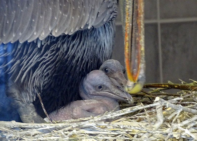 Im Winterquartier der Pelikane vom Tierpark Berlin – in der Nähe vom Schloss Friedrichsfelde – sind zwei Braunpelikanen geschlüpft.