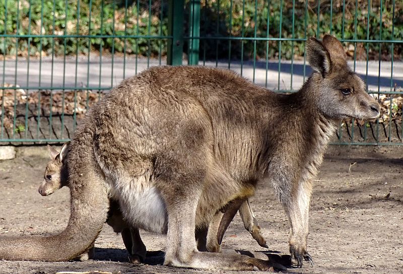 Ein Jungtier von den neugeborenen Tasmanischen Grauen Riesenkängurus im Tierpark Berlin hüpft bereits auf der Anlage herum und möchte gerne in einen Beutel eines großen Kängurus krauchen, wo aber bereits ein weiteres Jungtier heraus guckt.